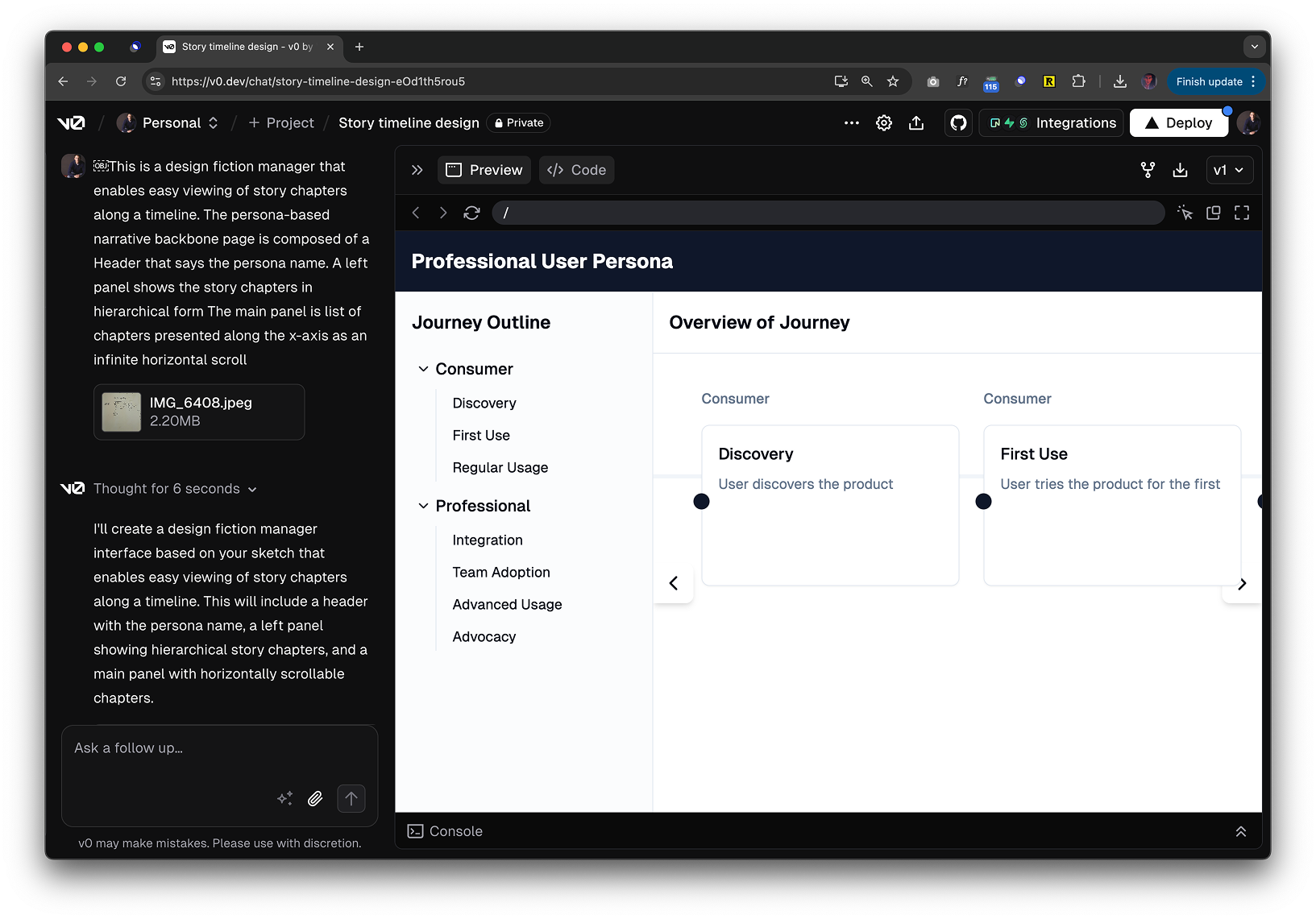 In startup settings or personal projects, the pace is faster, the constraints are fewer, and the feedback loops are shorter. Tools like v0.dev shine here because they collapse the gap between ideation and implementation. Designers can sketch out an idea, write a structured narrative of the product vision and use that narrative as a living spec for prototyping and development.
