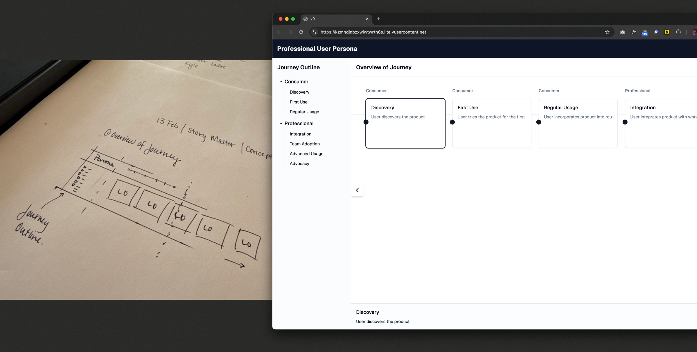 This approach eliminated traditional handoffs—we are co-evolving the product in real-time. Now, as we look toward the next version, we're in discovery mode again. New concepts take shape through narrative elaboration, Mural flows, Notion user stories, and team conversations, with v0.dev ready to help us prototype and test once ideas crystallize.