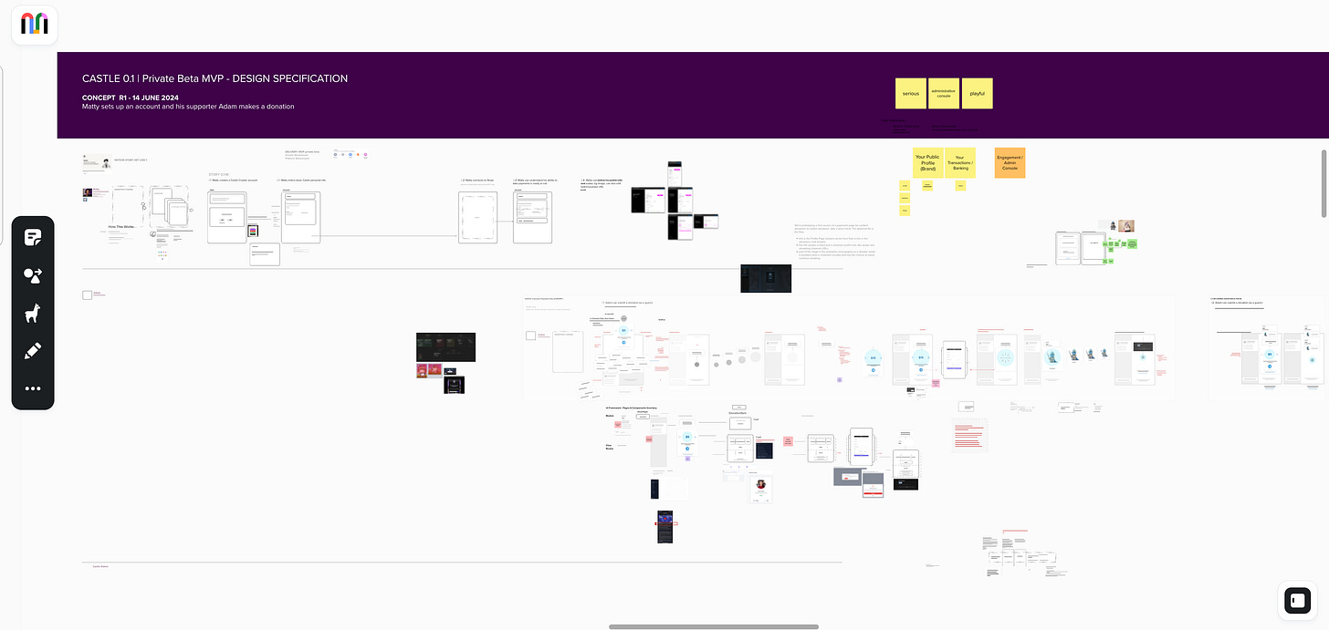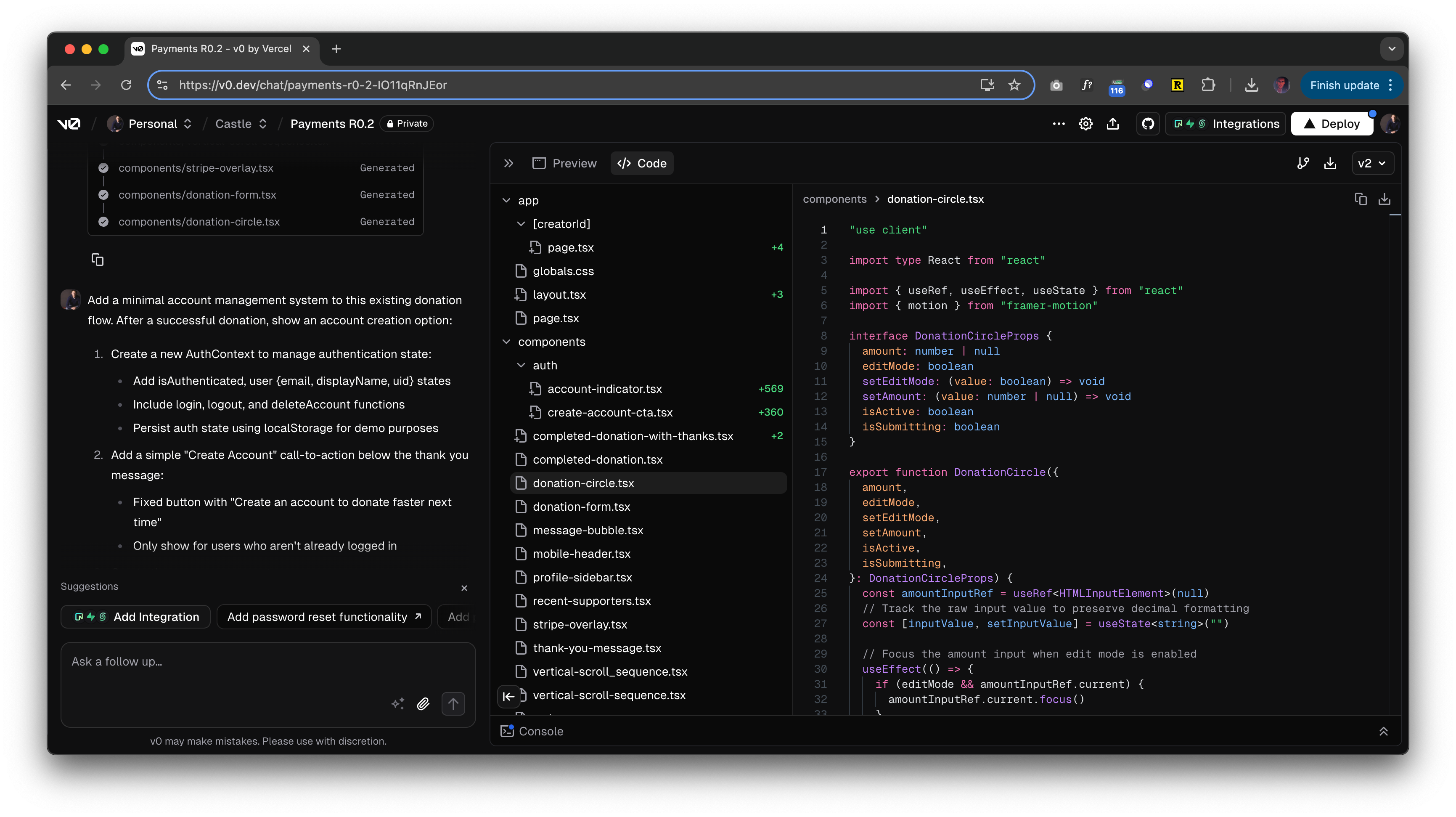 We experienced this firsthand while building Castle, a creator support platform currently in private alpha. We began with a narrative describing what we might build, then mapped out the interaction flows to arrive at a working framework. From there, conceptualizing became straightforward. Our backend developer Mark could use the v0.dev-generated UI almost as-is, while our creative director Ryan focused on visual and motion graphics design for individual components which I can then integrate into v0.dev prototypes. We have a tight cadence of breaking down releases into smaller technical sequences that each introduce incremental change.